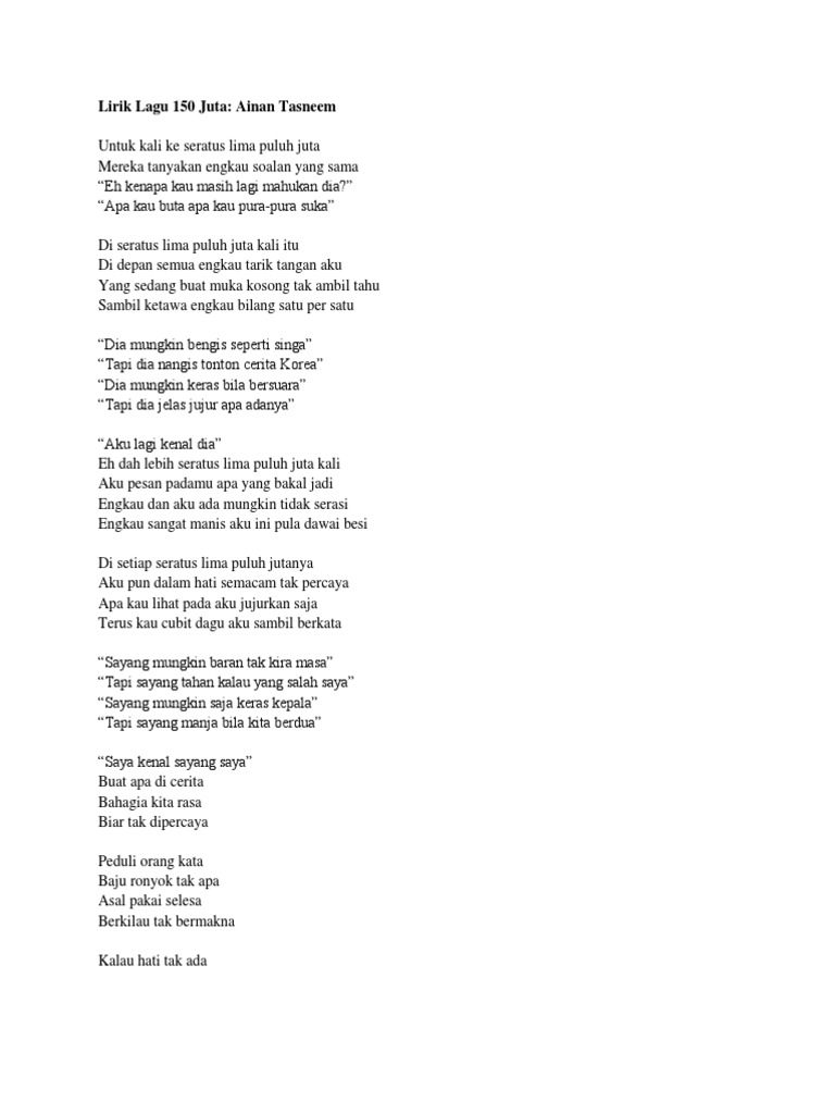 Lagu 150 Juta Ainan Tasneem Lirik By Da_Samantha480 12 Apr, 2022 Post a Comment 150 Juta Ainan Tasneem Lirik Youtube Chent Qaseh03 Lagu 150 Juta Kali 150 Juta Ainan Tasneem Lirik Youtube Lirik Lagu 150 Juta Pdf Share No comments for "Lagu 150 Juta Ainan Tasneem Lirik"